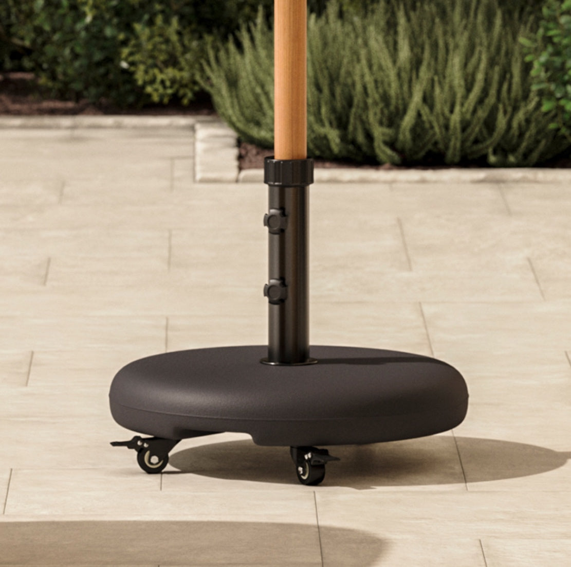 Wheel, wheel, wheel! That one was for the hockey fans. This is for everyone: the Paima umbrella base — but with wheels. Easily move shade around your space and stay sun-safe all summer long. Molded from concrete, the wheeled Paima has handy wheeled casters, and two adapters to help move and secure umbrellas of varying sizes.