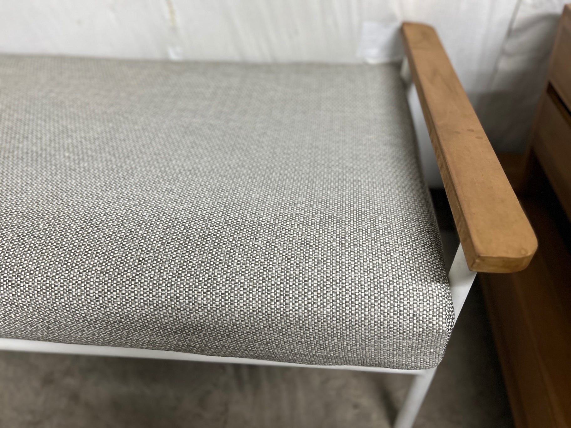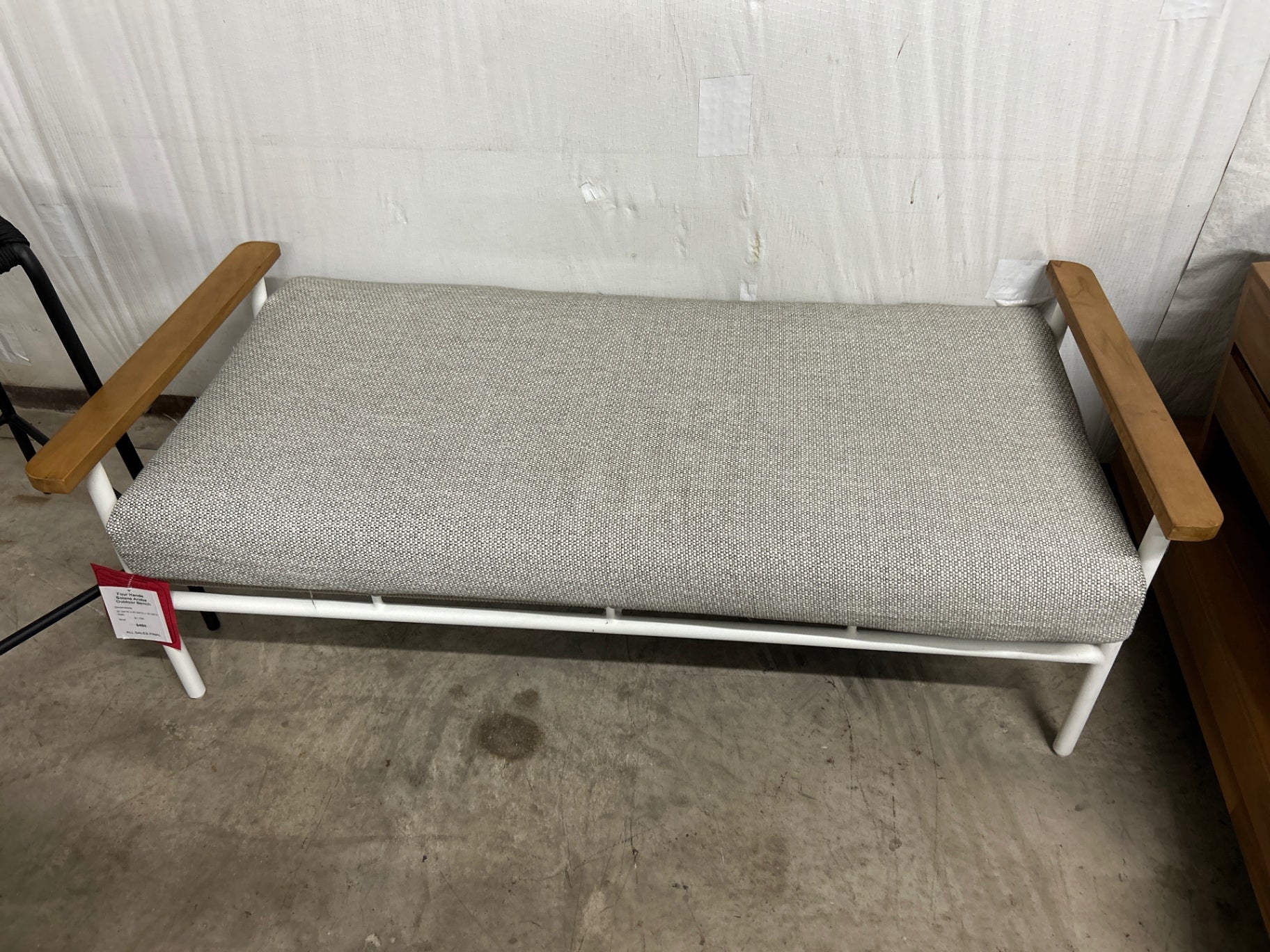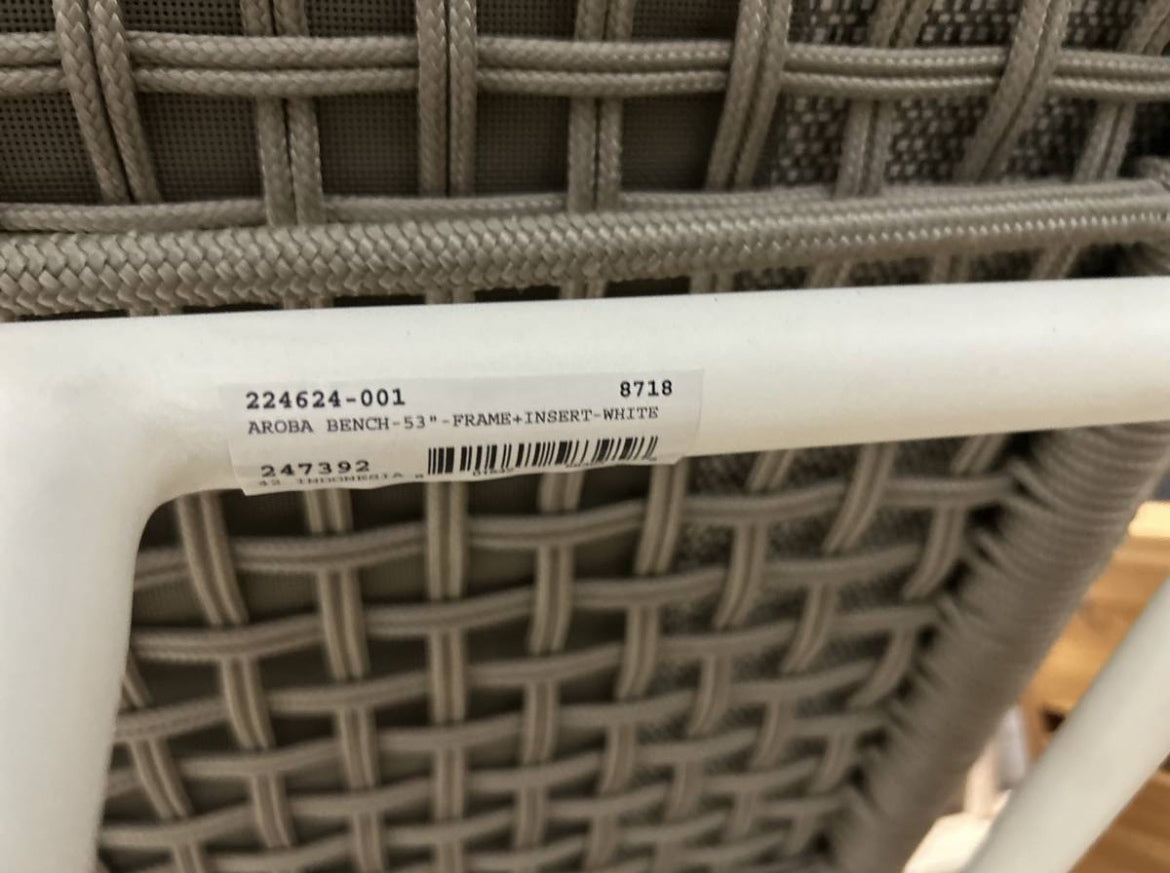 Mixed materials, made for entertaining. White-finished aluminum frames durable, weather-resistant seating in a stone grey, with woven rope decking and slim arm rests of FSC-certified teak. Cover or store indoors during inclement weather and when not in use.