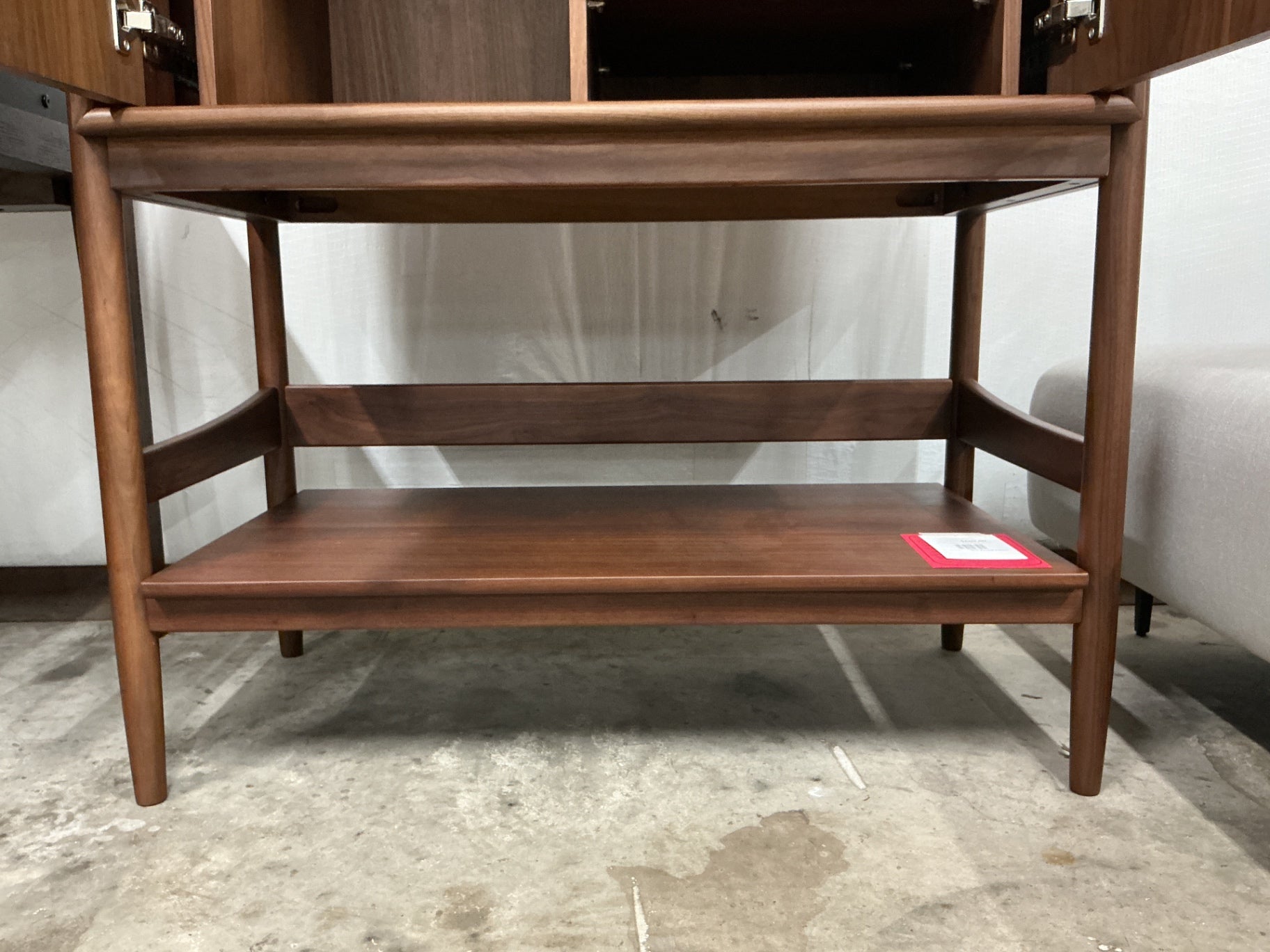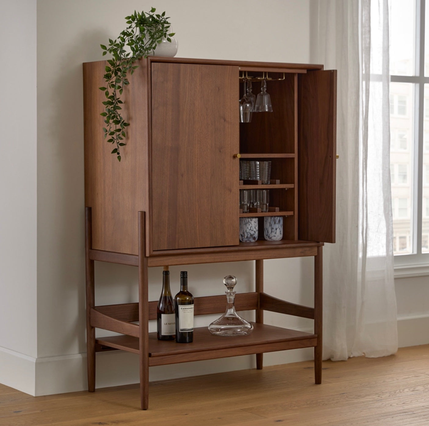 If you’ve ever dreamed of looking worldly, smart, even a little stern, let us introduce you to the Cotu Bar Cabinet. Made of solid and veneered walnut wood, the Cotu’s sleek pocket doors conceal thoughtful bar storage, including glass holders and bottle nooks. Finished with brass hardware, this mid-century modern looker is ready to add some flair to your living room.