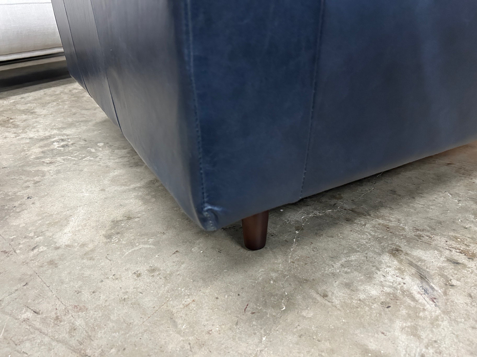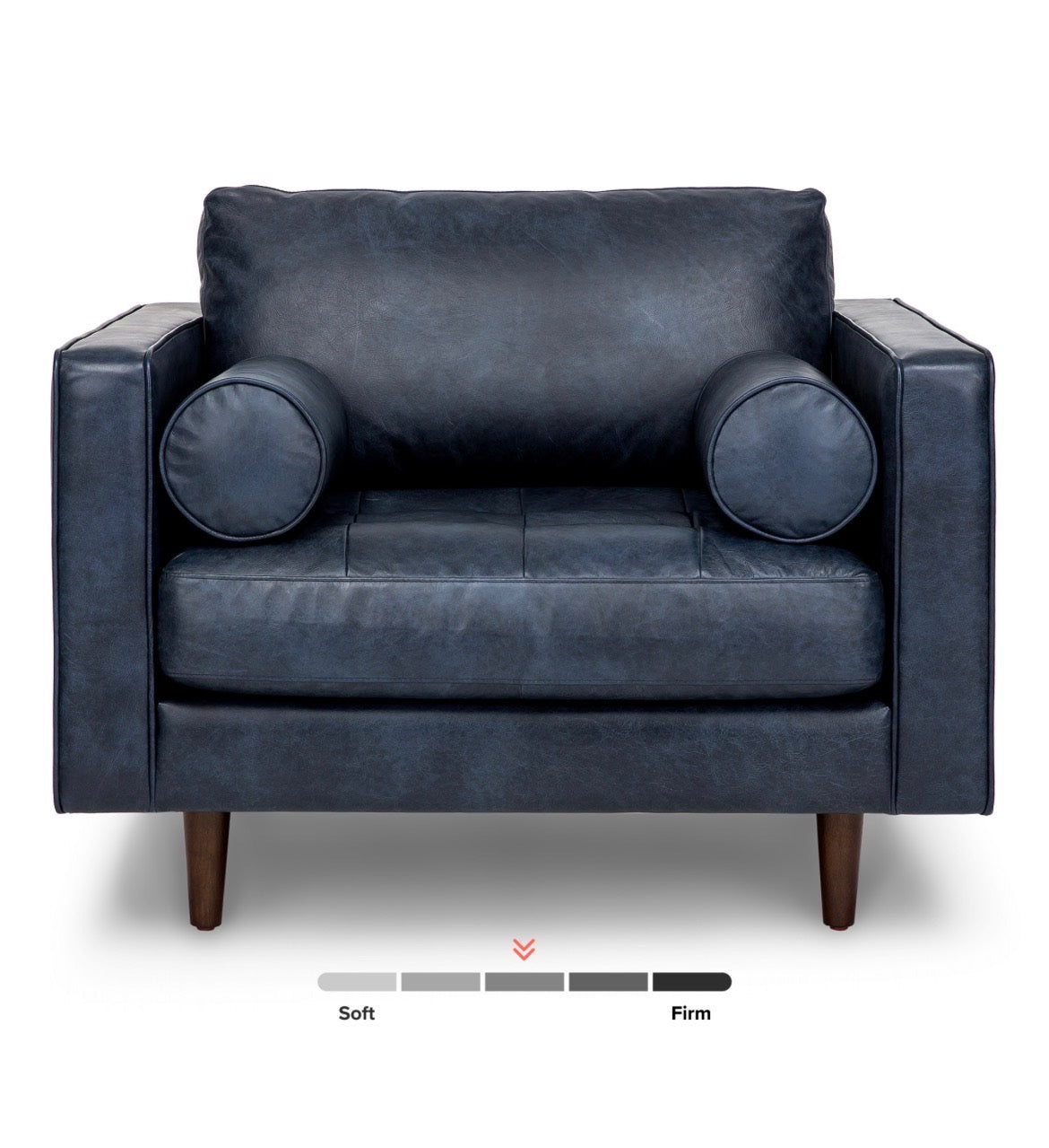 Our most popular sofa, reimagined as a large, cozy lounge chair. This modern take on a mid-century classic features clean lines, a tufted seat, and a luxuriously stuffed back cushion. Two matching round bolsters complete the look. Natural color variations, wrinkles and creases are part of the unique characteristics of this leather and it will develop a vintage slouchy look with regular use.