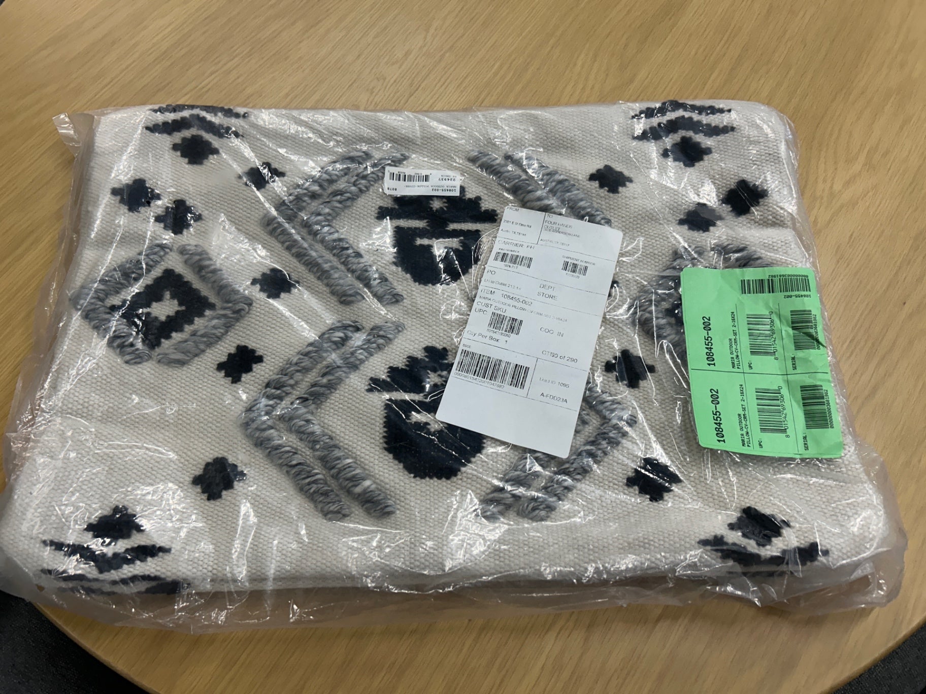 Toss in some texture, indoors or out. Made entirely from recycled plastics, a set of eco-friendly outdoor throw pillows features a mix of flatwoven and embroidered pattern and texture in graphic black and grey. Store inside during inclement weather.