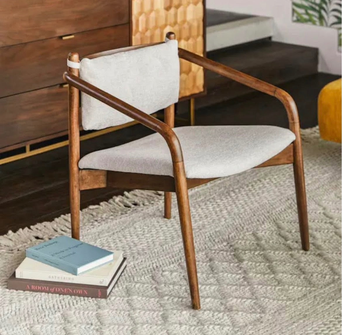 The Lento Chalk Gray Lounge Chair features a rich, walnut-stained wood frame and comfortable padded seat. The curved silhouette adds suave, while the light and airy fabric keeps the look grounded. Imagine it in a peaceful corner of your bedroom with the sunlight streaming in, or as a lux place to tie your shoes in the morning. Wherever you need it, the Lento fits right in.