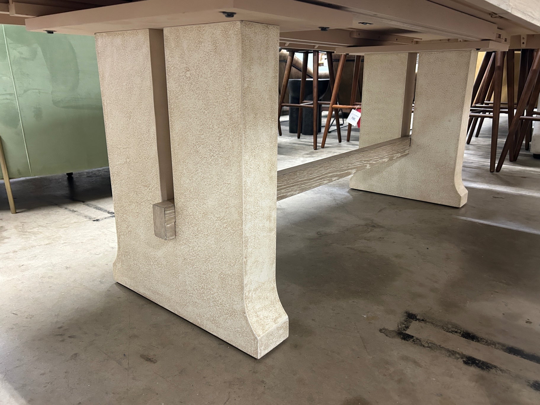 Linger for memorable meals with family and friends at this inviting modern farmhouse-styled table that offers a retreat from your fast-paced lifestyle. Crafted of Oak Veneers, the Cascade Rectangle Dining Table features a stretcher that joins the 2-pedestal base, with the entire base finished in a creamy-colored textured gesso with crackle. The tabletop is a soft taupe finish on oak veneers with dry brushing. With one 22-inch leaf, the table extends to 106 inches long, accommodating 2 arm chairs and 6 side chairs.