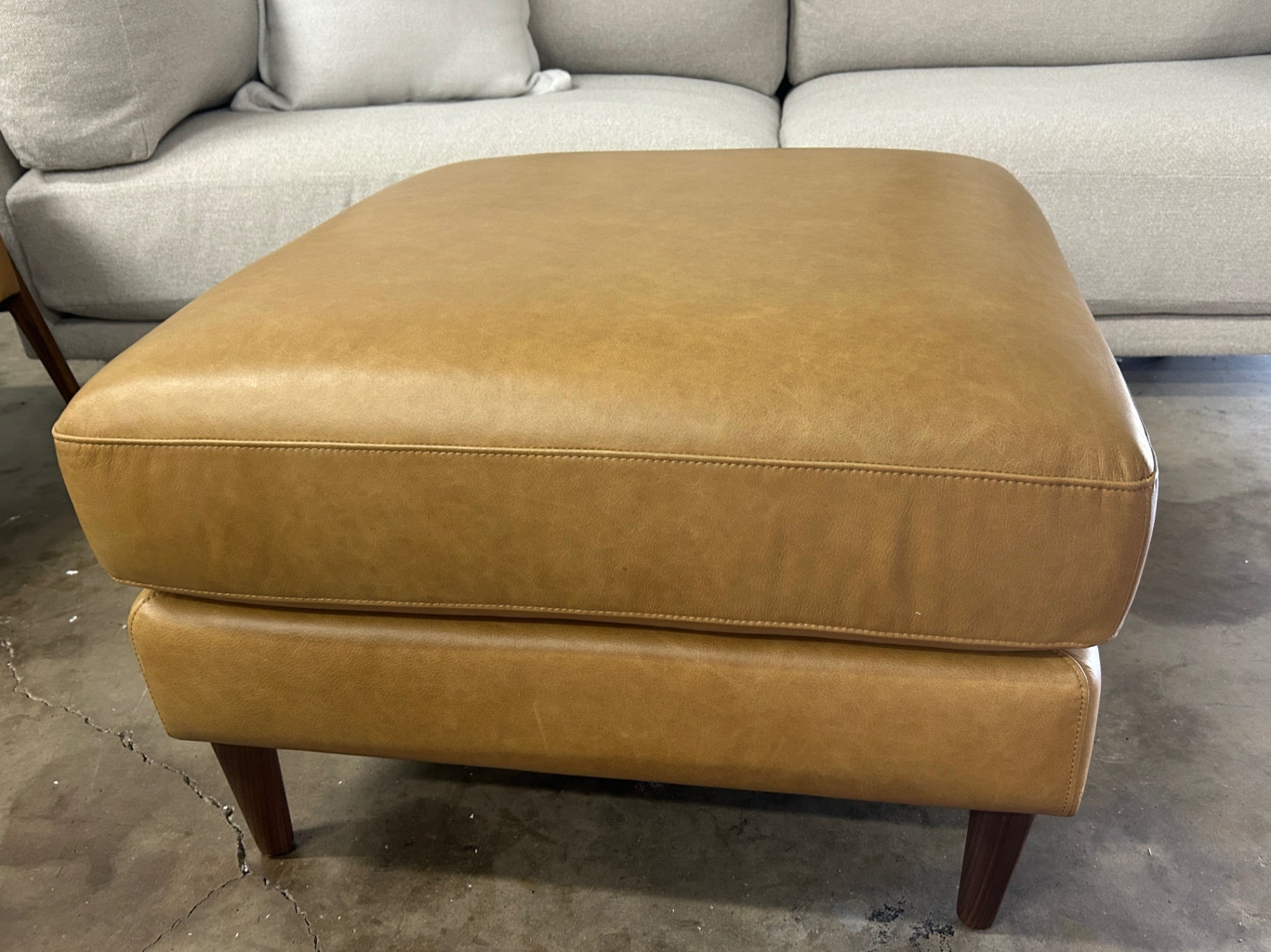 Elevate your home decor with this stylish leather ottoman from Havenly. This unique piece will add a touch of sophistication to any room.