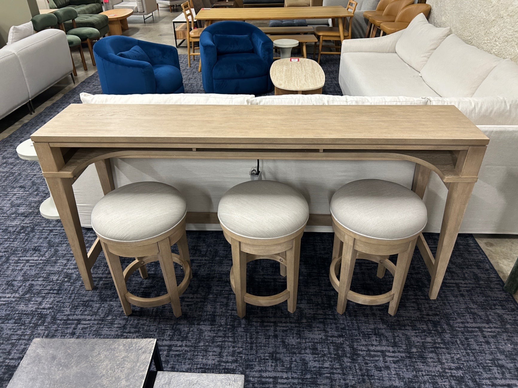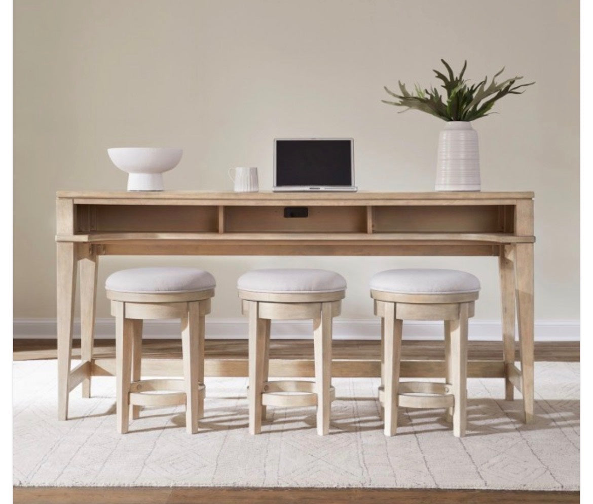 Turn your house into a home with the Brentwood bar console. Meticulously crafted using Rubberwood solids and Split Heart White Oak veneers, this set features a Sandstone finish. The sleek design of the table is complemented by a discreet yet powerful charging station, featuring 2 outlets, 1 USB-A, and 1 USB-C charging ports. This smart addition allows you to keep your devices powered up and within arm's reach, eliminating the need for cumbersome extension cords or searching for available outlets. Perfectly suited for placement behind the sofa, the console bar table becomes a versatile piece that not only adds surface space for drinks or decor but also functions as an extra seating area. Whether you're entertaining guests or creating a cozy reading nook, this table effortlessly adapts to your dynamic lifestyle. The star of the show is the padded swivel seat on the console stools, upholstered in luxurious Textured Taupe fabric. The plush and inviting surface not only adds a layer of comfort but also introduces an element of sophistication to your space. The Brentwood collection is a true statement of sophistication and practicality.